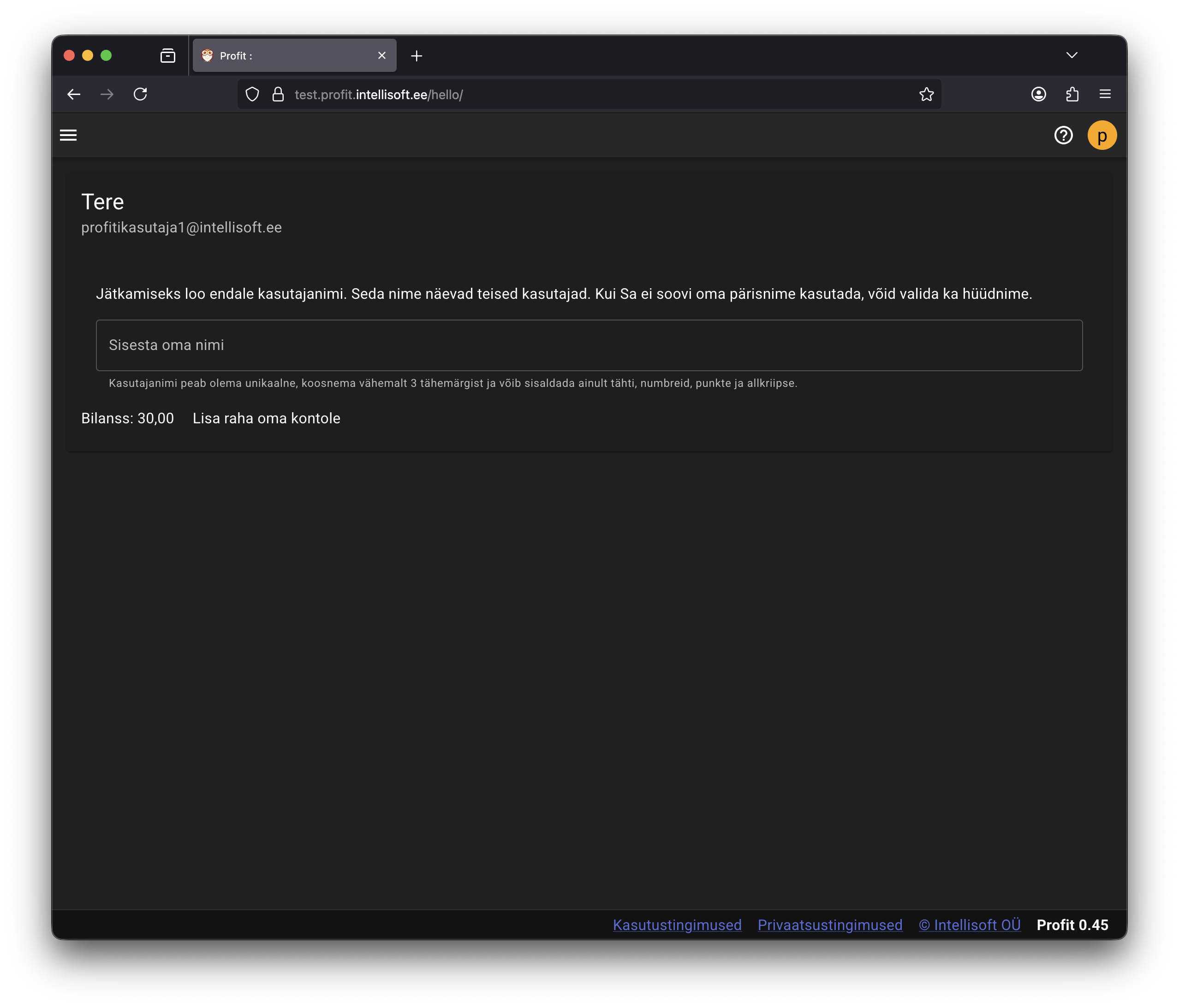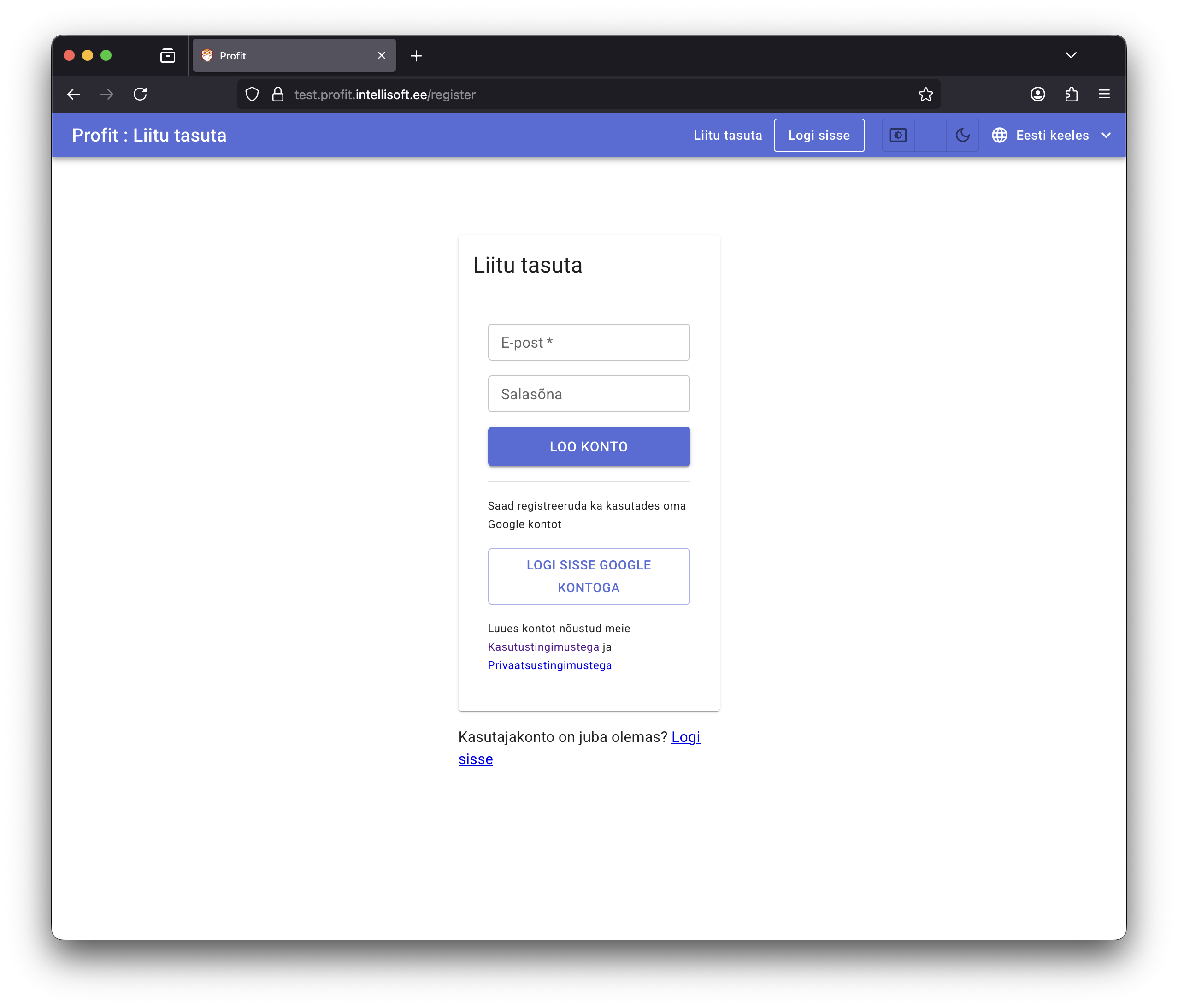 Registreerimiseks minge aadressile https://profit.intellisoft.ee/ ja valige "Liitu Profitiga tasuta"